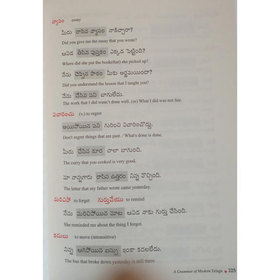Another thing you should pay attention to is pronouns (starting on p. 41). Pronouns are given to you as charts. A particular feature of Telugu is that 'the first person plural' has two kinds of pronouns: inclusive and exclusive. Inclusive includes the listener, while exclusive excludes the listener.